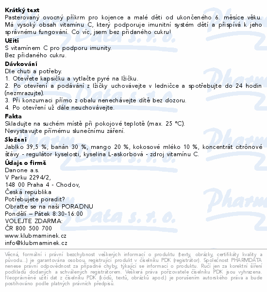 Pasterovaný ovocný příkrm pro kojence a malé děti od ukončeného 6. měsíce věku. Má vysoký obsah vitamínu C, který podporuje imunitní systém dětí a přispívá k jeho správnému fungování. Co víc, jsem bez přidaného cukru!Použití