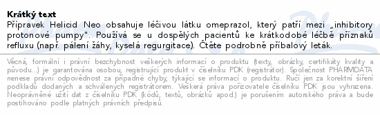 Přípravek Helicid Neo obsahuje léčivou látku omeprazol, který patří mezi "inhibitory protonové pumpy". Používá se u dospělých pacientů ke krátkodobé léčbě příznaků refluxu (např. pálení žáhy, kyselá regurgitace). Čtěte pozorně příbalový leták.Použití