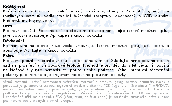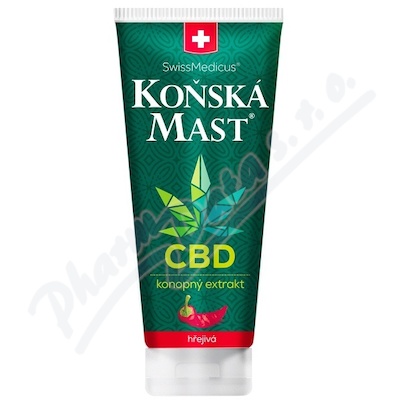 Koňská mast s CBD je unikátní bylinný balzám vyrobený z 25 druhů bylinných a rostlinných extraktů podle tradiční švýcarské receptury, obohacený o CBD extrakt. Přípravek má hřejivý účinek.Použití
