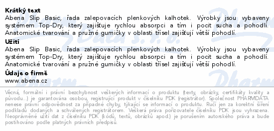 Abena Slip Basic, řada zalepovacích plenkových kalhotek. Výrobky jsou vybaveny systémem Top-Dry, který zajišťuje rychlou absorpci a tím i pocit sucha a pohodlí. Anatomické tvarování a pružné gumičky v oblasti třísel zajišťují větší pohodlí.Použití
