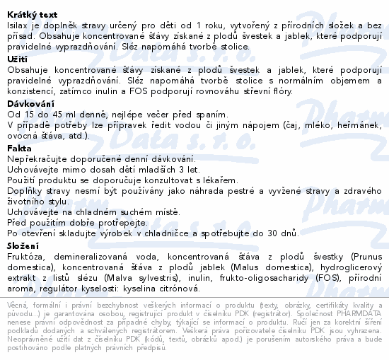 Isilax je doplněk stravy určený pro děti od 1 roku, vytvořený z přírodních složek a bez přísad. Obsahuje koncentrované šťávy získané z plodů švestek a jablek, které podporují pravidelné vyprazdňování. Sléz napomáhá tvorbě stolice.Použití