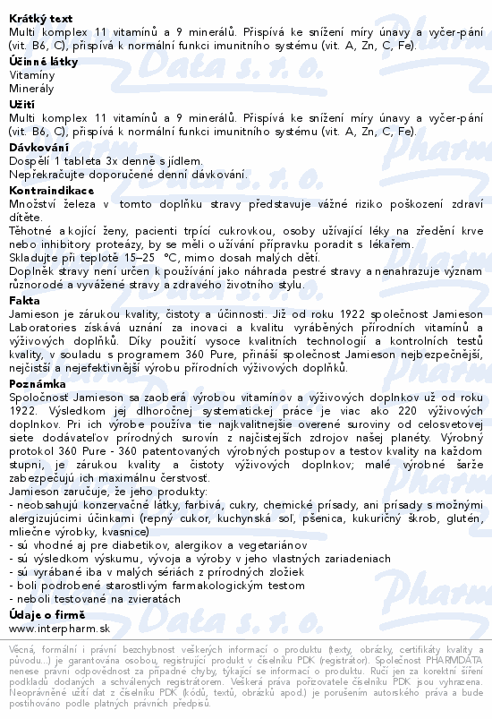 Multi komplex 11 vitamínů a 9 minerálů. Přispívá ke snížení míry únavy a vyčerÂpání (vit. B6, C), přispívá k normální funkci imunitního systému (vit. A, Zn, C, Fe).Použití