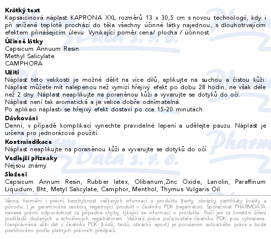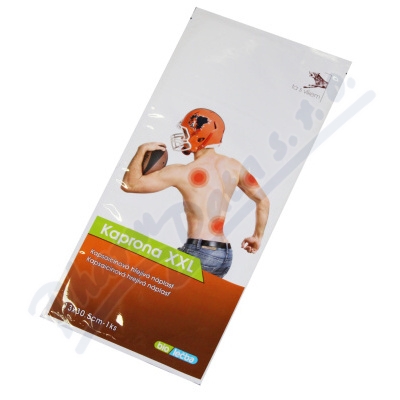 Kapsaicinová náplast KAPRONA XXL rozměrů 13 x 30, 5 cm s novou technologií, kdy i při snížené teplotě prochází do těla všechny účinné látky najednou, s dlouhotrvajícím efektem přinášejícím úlevu. Vynikající poměr cenaPoužití