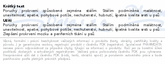 Poruchy prokrvení způsobené zejména stářím. Stářím podmíněná malátnost, unavitelnost, apatie, pohybové potíže, nechutenství, hubnutí, špatná kvalita srsti u psů.Použití