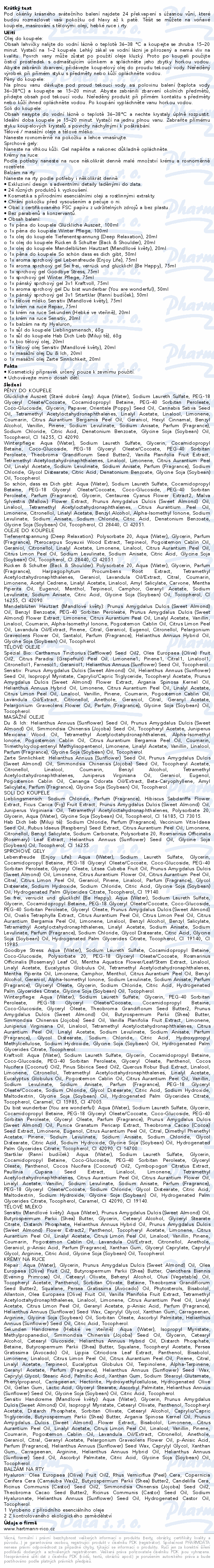 Pod okénky krásného svátečního balení najdete 24 překvapení s úžasnou vůní, které budou rozmazlovat vaši pokožku od hlavy až k patě. Těšit se můžete na voňavé koupele, masírování s tělovými oleji, hebké ruce i rty.Použití
