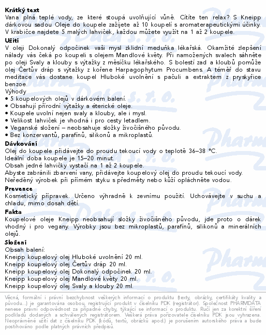 Vana plná teplé vody, ze které stoupá uvolňující vůně. Cítíte ten relax? S Kneipp dárkovou sadou Oleje do koupele zažijete až 10 koupelí s aromaterapeutickými účinky. V krabičce najdete 5 malých lahviček, každou můžete využít na 1 až 2 koupele.Použití