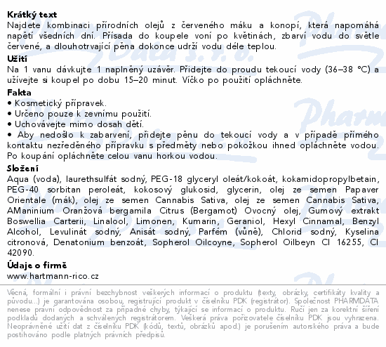 Najdete kombinaci přírodních olejů z červeného máku a konopí, která napomáhá napětí všedních dní. Přísada do koupele voní po květinách, zbarví vodu do světle červené, a dlouhotrvající pěna dokonce udrží vodu déle teplou.Použití