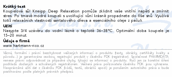 Koupelová sůl Kneipp Deep Relaxation pomůže zklidnit vaše vnitřní napětí a zmírnit stres. Po tmavě modré koupeli s uvolňující vůní krásně propadnete do říše snů. Využívá totiž relaxačních vlastností santalového dřeva a esenciálního oleje z pačuli.Použití
