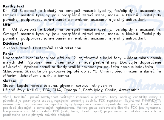 Krill Oil Superba2 je bohatý na omega3 mastné kyseliny, fosfolipidy a astaxanthin. Omega3 mastné kyseliny jsou prospěšné zdraví srdce, mozku a kloubů. Fosfolipidy pomáhají podporovat zdraví buněk a membrán, astaxanthin je silný antioxidant.Použití