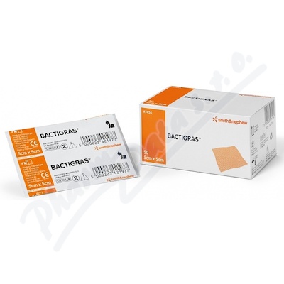 Bactigras je antiseptické nepřilnavé krytí z tylové tkaniny impregnované jemným bílým parafinem s účinnou širokospektrální antiseptickou složkou.Použití
