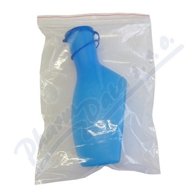 Modrá láhev na moč s uzávěrem v PE sáčku - plastová láhev o objemu 1000ml, s dělenou stupnicí po 50ml, opatřená modrým uzávěrem. Je určena zejména špatně pohyblivým nebo nepohyblivým pacientům (mužům) k zachycení jednotlivých porcí moči.Použití