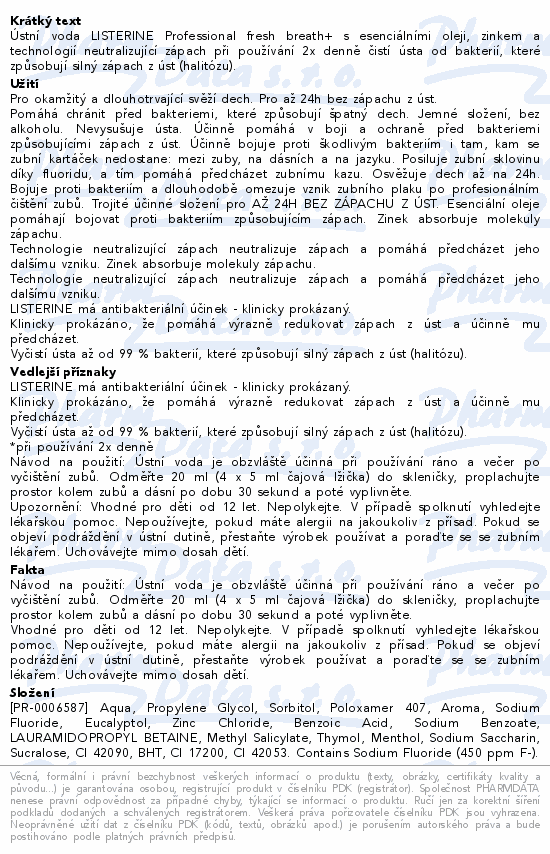 Ústní voda LISTERINE Professional fresh breath+ s esenciálními oleji, zinkem a technologií neutralizující zápach při používání 2x denně čistí ústa od bakterií, které způsobují silný zápach z úst (halitózu).Použití