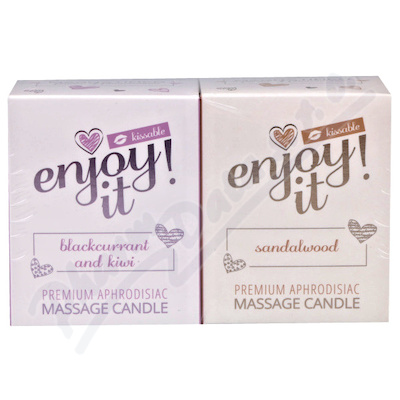 Prémiové afrodiziakální masážní svíčky Enjoy it! z řady MAGNETIFICO - power of pheromones s vůní santalového dřeva a Blackcur-kiwi, 2x70 ml. Hydratuje, zjemňuje a regeneruje pokožku.Použití
