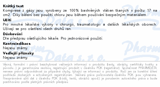 Komprese z gázy jsou vyrobeny ze 100% bavlněných vláken tkaných v počtu 17 na cm2. Díky bělení bez použití chloru jsou během používání bezpečným materiálem.Použití