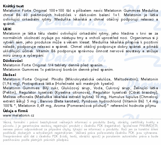 Melatonin Forte Original 100+100 tbl s příbalem navíc Melatonin Gummies Meduňka chmel B6 60 pektinových hvězdiček v dárkovém balení 1+1. Melatonin je látka ovlivňující cirkadiální rytmy. Meduňka lékařská a chmel otáčivý podporují relaxaci a spánek.Použití