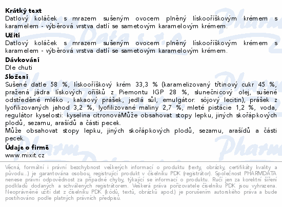 Datlový koláček s mrazem sušeným ovocem plněný lískooříškovým krémem s karamelem - výběrová vrstva datlí se sametovým karamelovým krémem.Použití