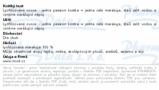 Lyofilizované ovoce - jedna passion kostka = jedna celá marakuja, stačí zalít vodou a vznikne osvěžující nápoj.Použití