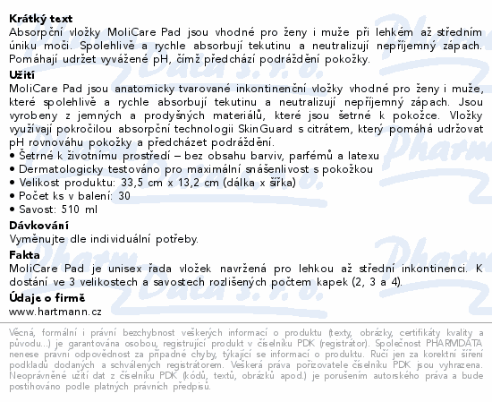 Absorpční vložky MoliCare Pad jsou vhodné pro ženy i muže při lehkém až středním úniku moči. Spolehlivě a rychle absorbují tekutinu a neutralizují nepříjemný zápach. Pomáhají udržet vyvážené pH, čímž předchází podráždění pokožky.Použití