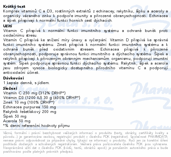 Komplex vitaminů C a D3, rostlinných extraktů z echinacey, rakytníku, šípku a aceroly a organicky vázaného zinku k podpoře imunity a přirozené obranyschopnosti. Echinacea a šípek přispívají k normální funkci horních cest dýchacích.Použití