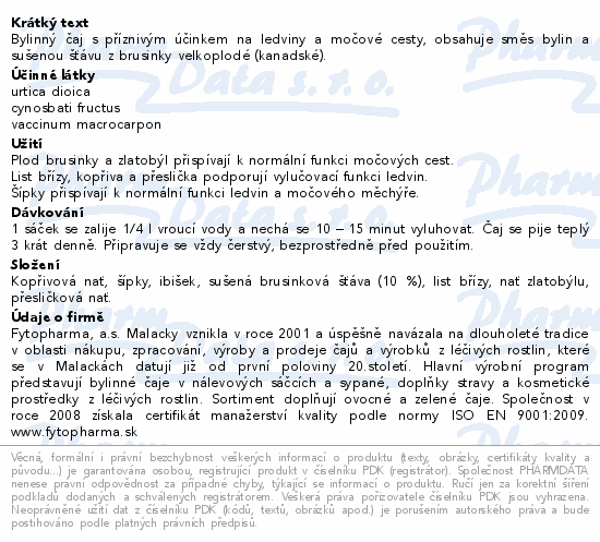 Bylinný čaj s příznivým účinkem na ledviny a močové cesty, obsahuje směs bylin a sušenou šťávu z brusinky velkoplodé (kanadské).Použití