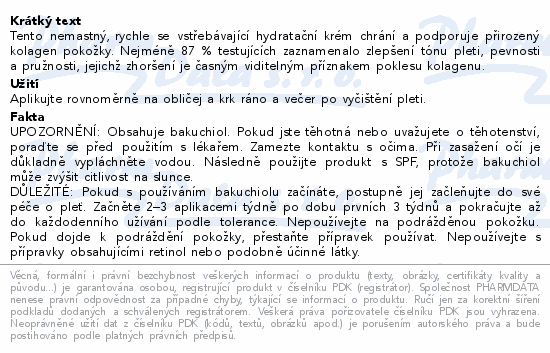 Tento nemastný, rychle se vstřebávající hydratační krém chrání a podporuje přirozený kolagen pokožky. Nejméně 87 % testujících zaznamenalo zlepšení tónu pleti, pevnosti a pružnosti, jejichž zhoršení je časným viditelným příznakem poklesu kolagenu.Použití