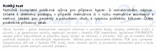 Nutričně kompletní prášková výživa pro přípravu hyper- či izokalorického nápoje. Určena k dietnímu postupu v případě malnutrice či v riziku malnutrice související s nemocí. Ideální pro pacienty s poruchami chuti, s vysokou potřebou bílkovin. Čtěte pozorně příbalový leták.Použití