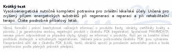 Vysokoenergetická nutričně kompletní potravina pro zvláštní lékařské účely. Určená pro zvýšený příjem energetických substrátů při regeneraci a reparaci a při rehabilitační terapii. Čtěte pozorně příbalový leták.Použití