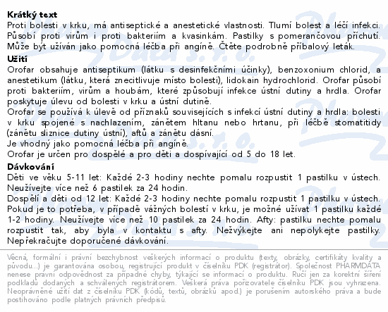 Proti bolesti v krku, má antiseptické a anestetické vlastnosti. Tlumí bolest a léčí infekci. Působí proti virům i proti bakteriím a kvasinkám. Pastilky s pomerančovou příchutí. Může být užíván jako pomocná léčba při angíně. Čtěte pozorně příbalový leták.Použití