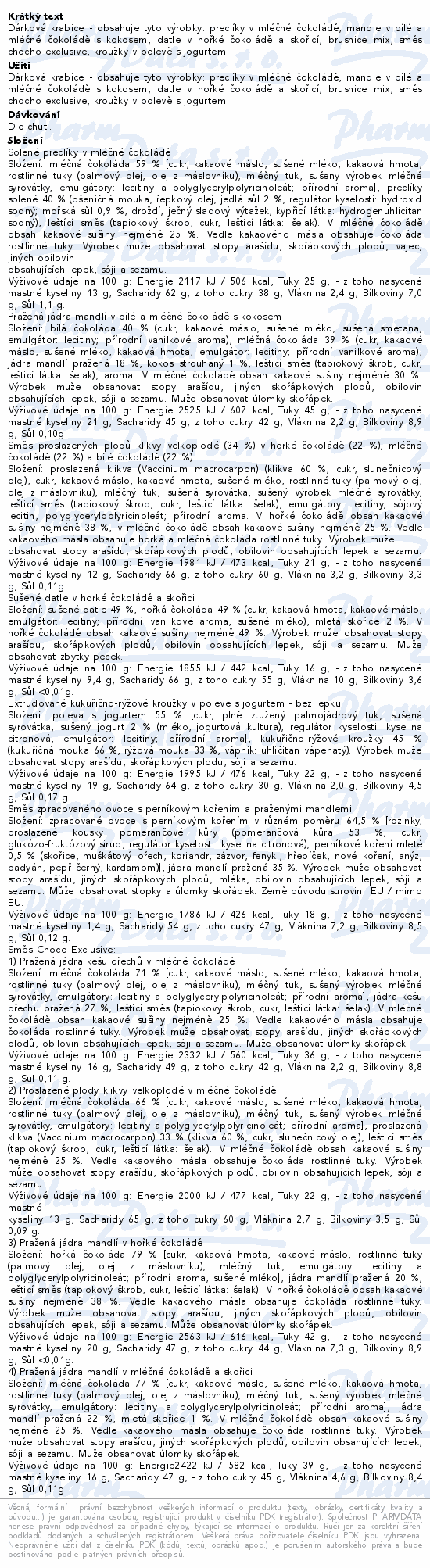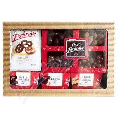 Dárková krabice - obsahuje tyto výrobky: preclíky v mléčné čokoládě, mandle v bílé a mléčné čokoládě s kokosem, datle v hořké čokoládě a skořicí, brusnice mix, směs chocho exclusive, kroužky v polevě s jogurtemPoužití