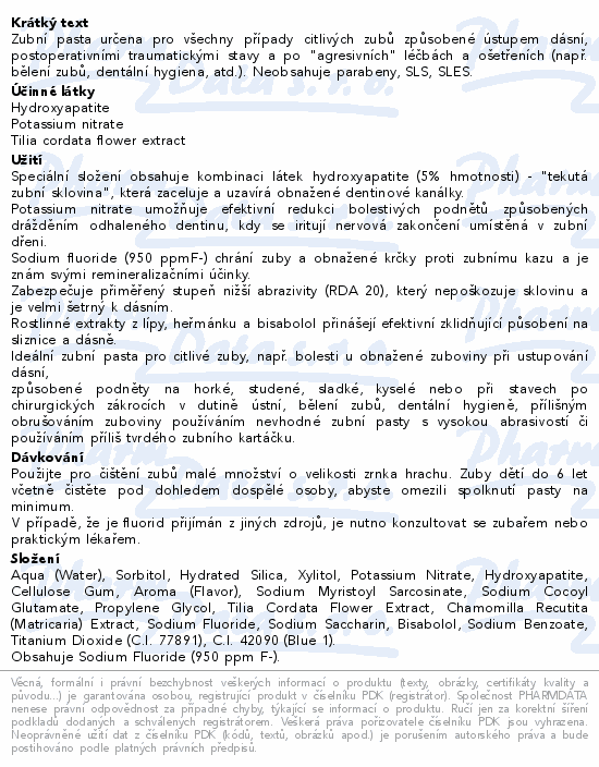 Zubní pasta určena pro všechny případy citlivých zubů způsobené ústupem dásní, postoperativními traumatickými stavy a po "agresivních" léčbách a ošetřeních (např. bělení zubů, dentální hygiena, atd.). Neobsahuje parabeny, SLS, SLES.Použití