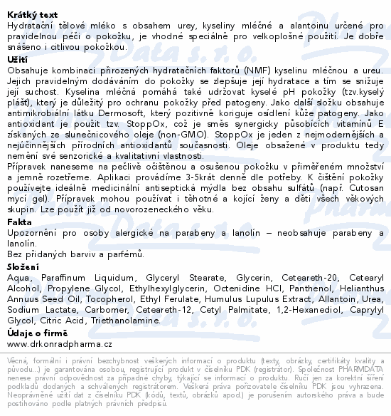 Hydratační tělové mléko s obsahem urey, kyseliny mléčné a alantoinu určené pro pravidelnou péči o pokožku,  je vhodné speciálně pro velkoplošné použití. Je dobře snášeno i citlivou pokožkou.Použití