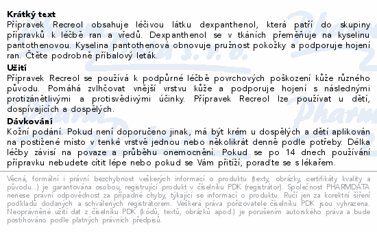Přípravek Recreol obsahuje léčivou látku dexpanthenol, která patří do skupiny přípravků k léčbě ran a vředů. Dexpanthenol se v tkáních přeměňuje na kyselinu pantothenovou. Kyselina pantothenová obnovuje pružnost pokožky a podporuje hojení ran. Čtěte pozorně příbalový leták.Použití