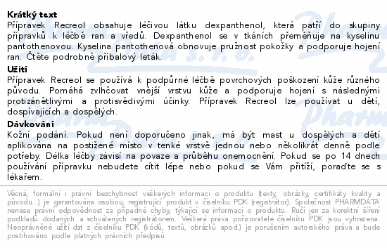 Přípravek Recreol obsahuje léčivou látku dexpanthenol, která patří do skupiny přípravků k léčbě ran a vředů. Dexpanthenol se v tkáních přeměňuje na kyselinu pantothenovou. Kyselina pantothenová obnovuje pružnost pokožky a podporuje hojení ran. Čtěte pozorně příbalový leták.Použití