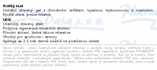 Unikátní chladivý gel s chondroitin sulfátem, kyselinou hyaluronovou a mentolem. Rychlá úleva, pouze lokálně.Použití