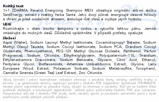 1+1 ZDARMA Revalid Energizing Shampoo MEN obsahuje originální aktivní složku SantEnergy, extrakt z rostliny Yerba Santa. Jeho dvojí účinek energizuje vlasové folikuly a chrání je před oxidačním stresem, stimuluje růst vlasů a zvyšuje jejich hustotu.Použití