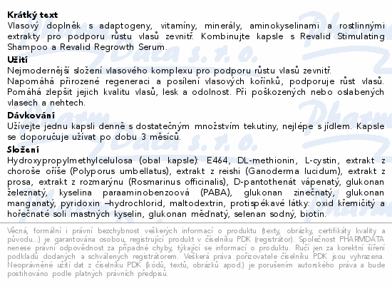 Vlasový doplněk s adaptogeny, vitamíny, minerály, aminokyselinami a rostlinnými extrakty pro podporu růstu vlasů zevnitř. Kombinujte kapsle s Revalid Stimulating Shampoo a Revalid Regrowth Serum.Použití