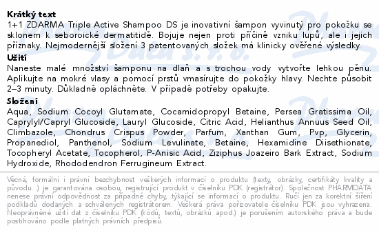 1+1 ZDARMA Triple Active Shampoo DS je inovativní šampon vyvinutý pro pokožku se sklonem k seboroické dermatitidě. Bojuje nejen proti příčině vzniku lupů, ale i jejich příznaky. Nejmodernější složení 3 patentovaných složek má klinicky ověřené výsledky.Použití