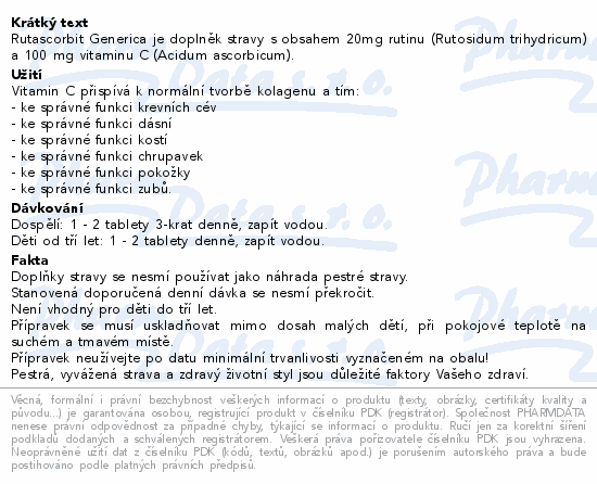 Rutascorbit Generica je doplněk stravy s obsahem 20mg rutinu (Rutosidum trihydricum) a 100 mg vitaminu C (Acidum ascorbicum).Použití