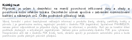Přípravek je určen k desinfekci na menší povrchové infikované rány a vředy a povrchová kožní infekční ložiska. Dezinfekční účinek spočívá v zabránění rozmnožování baktérií a některých virů. Čtěte pozorně příbalový leták.Použití