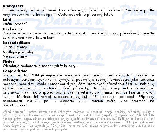 Homeopatický léčivý přípravek bez schválených léčebných indikací. Používejte podle rady odborníka na homeopatii. Čtěte pozorně příbalový leták.Použití
