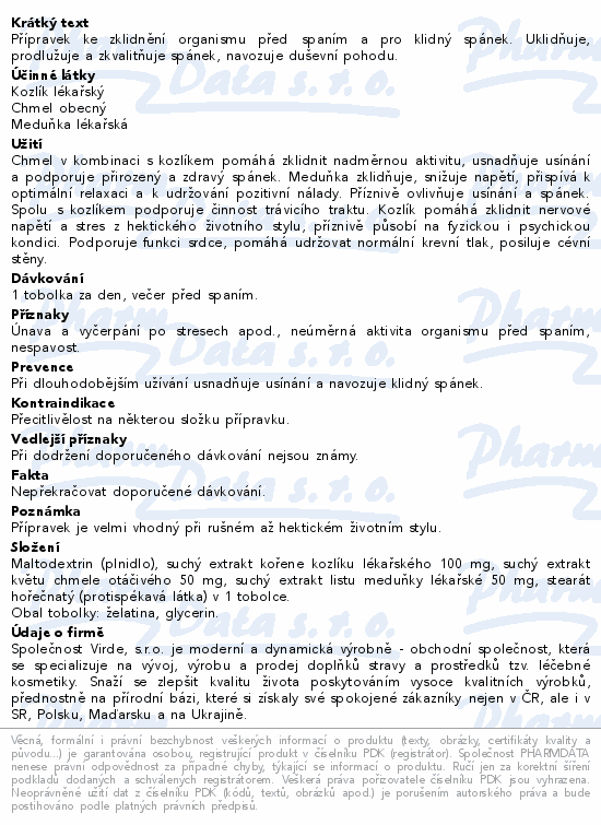 Přípravek ke zklidnění organismu před spaním a pro klidný spánek. Uklidňuje, prodlužuje a zkvalitňuje spánek, navozuje duševní pohodu.Použití