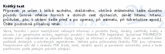 Přípravek je určen k léčbě suchého, dráždivého, obtížně ztišitelného kašle různého původu (virové infekce horních a dolních cest dýchacích, zánět hltanu, hrtanu, průdušek, plic; k utišení kašle před a po operaci, při astmatu, při tuberkulóze apod.). Čtěte pozorně příbalový leták.Použití