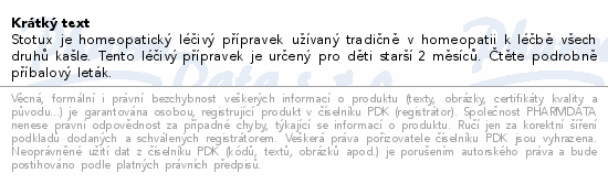 Stotux je homeopatický léčivý přípravek užívaný tradičně v homeopatii k léčbě všech druhů kašle. Tento léčivý přípravek je určený pro děti starší 2 měsíců. Čtěte pozorně příbalový leták.Použití