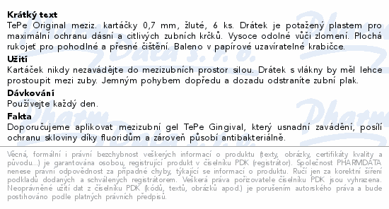 TePe Original meziz. kartáčky 0, 7 mm, žluté, 6 ks. Drátek je potažený plastem pro maximální ochranu dásní a citlivých zubních krčků. Vysoce odolné vůči zlomení. Plochá rukojeť pro pohodlné a přesné čištění. Baleno v papírové uzavíratelné krabičce.Použití