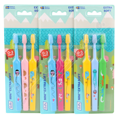 Sada dětských zubních kartáčků pro děti od 0 do 3 let. Malá trojúhelníková hlavice, x-soft vlákna s doporučovaným rovným zástřihem. Ploché držátko je ideální pro malou ruku i pro společné čištění s asistencí rodičů. 3 ks v balení, blistr.Použití
