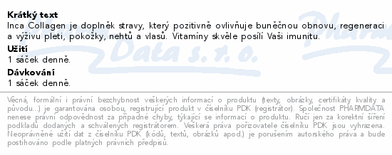 Inca Collagen je doplněk stravy, který pozitivně ovlivňuje buněčnou obnovu, regeneraci a výživu pleti, pokožky, nehtů a vlasů. Vitamíny skvěle posílí Vaši imunitu.Použití