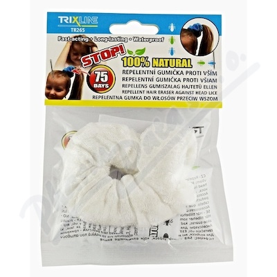 Repelentní Trixline gumička proti vším obsahující rozmarýn, eukalyptus, mátu peprnou, geraniol. Výrobek je voděodolný.Použití