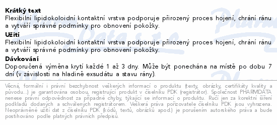 Flexibilní lipidokoloidní kontaktní vrstva podporuje přirozený proces hojení, chrání ránu a vytváří správné podmínky pro obnovení pokožky.Použití