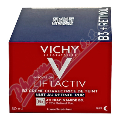 VICHY LIFTACTIV B3 Noční tónovací krém s čistým retinolem pro obnovu buněk na hyperpigmentované pleti. VÝZKUM EXPOZOMU: Nadprodukce melaninu je vyvolána expozicí agresivním vlivům během dne (UV záření, znečištění).Použití