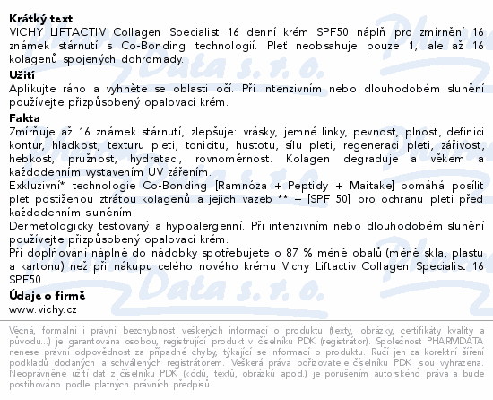 VICHY LIFTACTIV Collagen Specialist 16 denní krém SPF50 náplň pro zmírnění 16 známek stárnutí s Co-Bonding technologií. Pleť neobsahuje pouze 1, ale až 16 kolagenů spojených dohromady.Použití